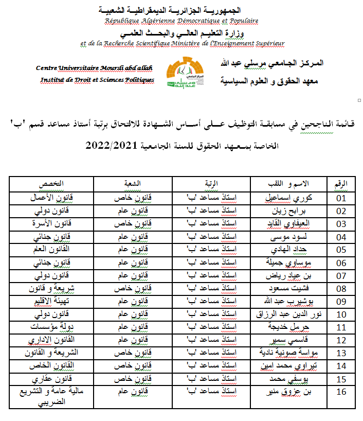 الرئيسية/Slide/قائمة الناجحين في مسابقة التوظيف على اساس الشهادة للالتحاق برتبة استاذ مساعد قسم’ب’للسنة الجامعية 2021 Slideأساتذةإعلانات قائمة الناجحين في مسابقة التوظيف على اساس الشهادة للالتحاق برتبة استاذ مساعد قسم’ب’للسنة الجامعية 2021 12 يونيو 2022 318 أقل من دقيقة 12 يونيو 2022 318 أقل من دقيقة اظهر المزيد شاركها فيسبوك تويتر لينكدإن مشاركة عبر البريد طباعة